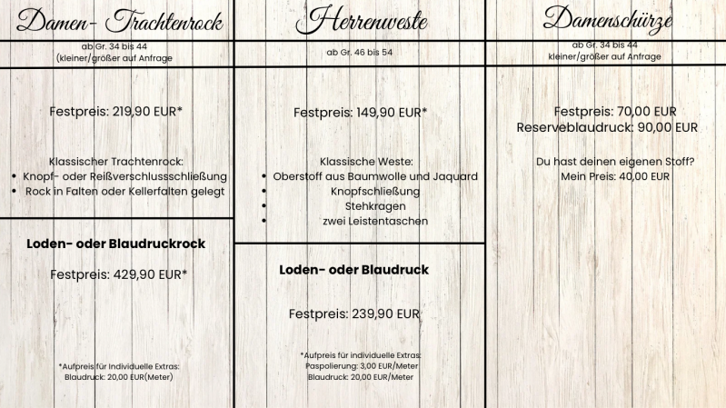 Die angegebenen Preise beinhalten die Näharbeit und das Material (Stoff, Futter, Einlage, Knöpfe etc.).